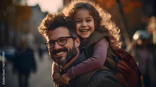 father Carries little girl On Shoulders During Walk In Park , created by generative AI technology