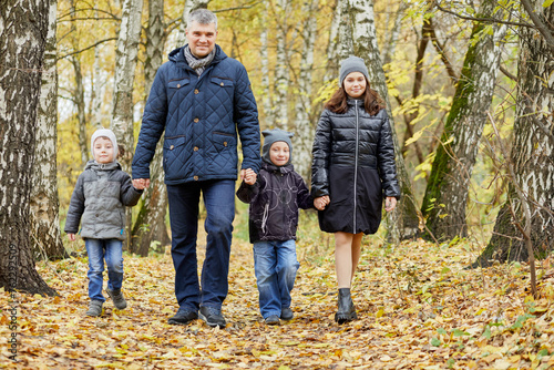 Father, daughter and two little sons walk down pathway in autumn park holding hands.