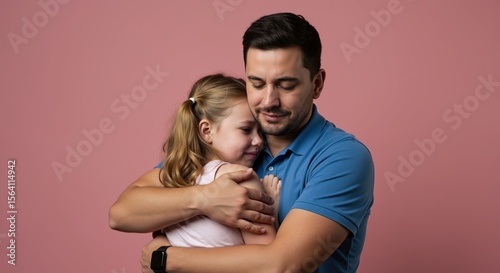 Father embracing daughter against pink background. Tender moment between man in blue shirt and child showing love and connection. Fatherhood and family bonding concept