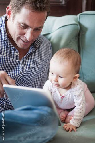 holding, playing, touching, portrait, home, childhood, responsibility, bonding, care, fun, togetherness, affection, happiness, love, counter, mature adult, baby, forehead, baby girl, man, two people, indoor, day, face to face, sitting, smiling, family, daughter, father, lifestyle