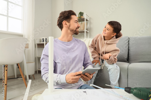 Father with tablet computer and his little son assembling shelf unit at home