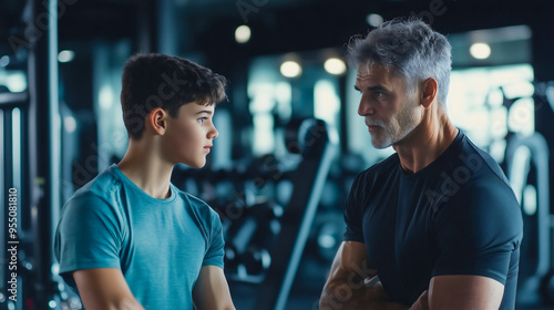 Father with teenage boy training at the gym Dad teaching son to lift dumbbell weights Family workout together Healthy active sporty life Fitness coach Athletic male parent Cardio machine Treadmill
