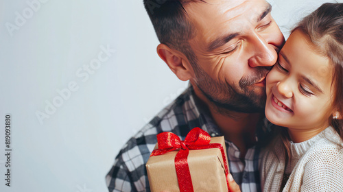 Father's day concept. Young man kissing his daughter cheek while holding a gift.Generative AI