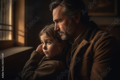 Father's Day photo - A tender moment between a father and child captured with warm lighting and soft, muted tones. Candid and natural style to capture genuine emotions. Generative ai.