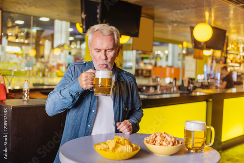 Favourite drink. Nice pleasant man holding a glass with beer while being in the sports club