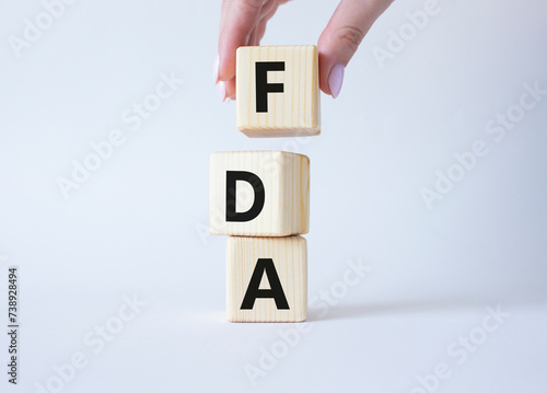 FDA - Food Drug Administration symbol. Wooden cubes with word FDA. Doctor hand. Beautiful white background. Medical and Food Drug Administration concept. Copy space.