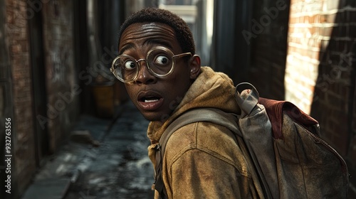 Fear in the Alley: A Nervous African American Man with Nerdy Glasses - Perfect for a Sports Interior Poster Capturing Urban Anxiety and Style!