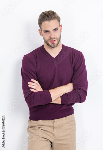Feeling confident and comfy. Confident man keep arms crossed isolated on white. Casual style