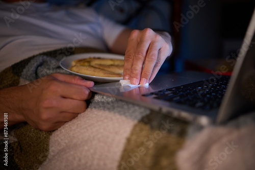 bed, bedtime, blanket, browsing, chill, comfort, comforter, communication, digital, cosy, cream, device, cup, dark, desktop, finger, food, hand, home, indoor, input, keyboard, laptop, meal, technology, midnight, napkin, night, night time, nocturnal, online, picnic, plate, relax, relaxation, rest, routine, screen, snack, soft, surface, typing, unwind, web, working, screening, viewing, mellow, sheet