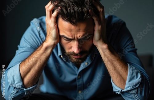 man, male, stressed, overwhelmed, frustrated, anxious, head, hand, dark, hair, beard, blue, shirt, emotional, tension, worry, despair, indoor, serious, expression, mental, health, discomfort, concentration, sharpened, problem, upset, distress, face, state, background