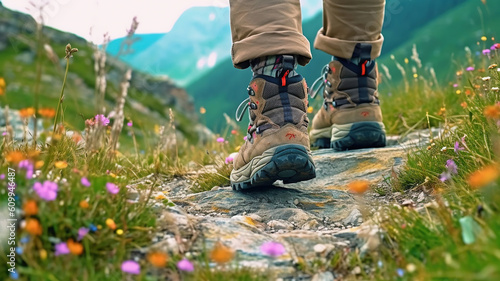 Feet in hiking trekking boots close-up. Hillside trail covered with flowers. Blurred mountain landscape for background. Generative Ai