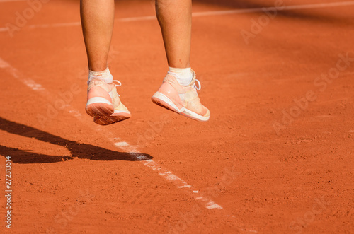 jump, shot, clay, red, female, leg, player, professional, racket, serve, set, shoe, net, orange, play, single, training, tournament, white, succeed, texture, slam, sport, summer, tennis, muscle, match, ball, background, closeup, competition, competitive, athletic, athletic, action, active, activity, athlete, court, equipment, league, health, fitness, foot, game