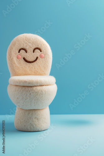 Felt toilet with a cute Kawaii happy face. Novelty smiling bathroom toilet ornament. Loo character, potty training, incontinence. Blue background with copy space.