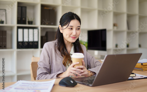 Female accountant working on laptop while holding a coffee cup in a modern office.