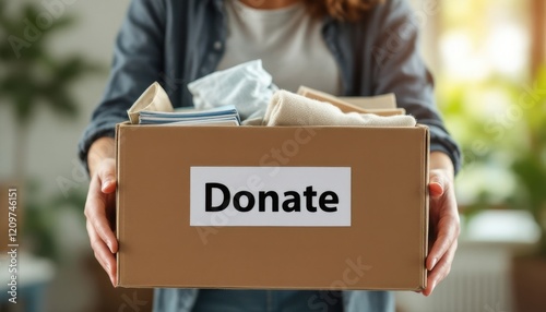 donation, box, clothes, female, adult, indoor, charitable, giving, help, support, contribute, cause, cardboard, gesture, community, aid, volunteer, hand, generosity, altruism, kindness, effort, empathy, assistance, helping, care, compassion, humanity, sharing, shelter, supply, collection, drive, campaign, needy, social, woman, human, beige, casual attire, shirt, blur, background, plant
