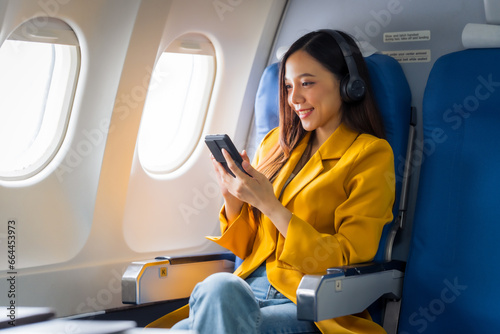 Female airplane passengers asian chinese people Entrepreneurs on Flight, Venturing Overseas Investments. Global Business Expansion, Foreign Markets, Strategic Financial Moves. Women in Business Suits
