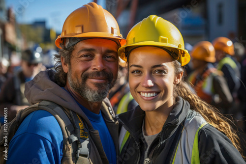 Female and male construction workers, wearing protective helmets on a construction site. Selective focus.