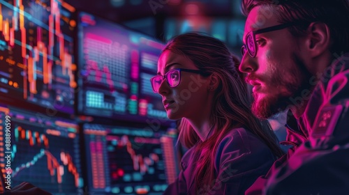 Female and Male Traders Analyzing Real-Time Financial Data and Reports About the State of the Finance Market. Stock Exchange Professionals Discussing Buy and Sell Options For Different, Generative AI