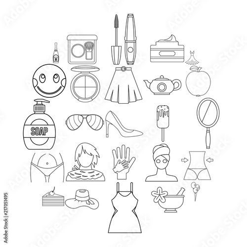 Female attributes icons set. Outline set of 25 female attributes vector icons for web isolated on white background