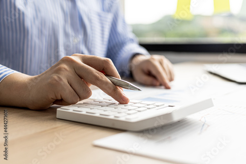 Female auditor pressing white calculator, she is a private company auditor, she is reviewing numbers of company financial statements before presenting them to senior management. Audit concept.