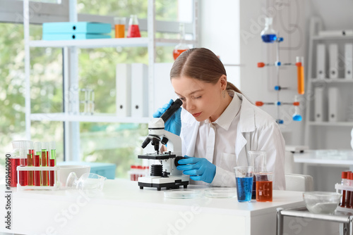 Female chemist looking through microscope at table in laboratory