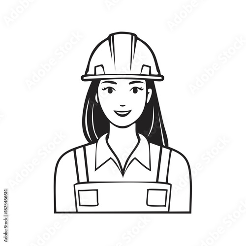 construction, men at work, female, woman, hard hat, helmet, protective, gear, safety, uniform, engineer, builder, supervisor, manager, person, people, illustration, drawing, vector, line, art, outline, black-and-white, monochrome, graphic, design, smiling, face, portrait, professional, job, occupation, workplace, construction site, industry, industrial, career, employment
