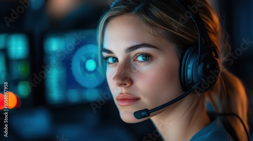 female, controller, headset, closeup, hand, technology, portrait, operator, sharpened, communication, monitoring, expression, professional, studio, indoor, blue, background, equipment, concentration, serious, lifestyle, modern, workspace, person, attention, working, digital, screen, interaction, casual attire, beauty, gaze, girl, youth, hair, light, calm, device, audio, noise, connection, optical, young, identity