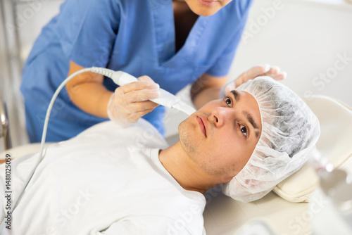 Female cosmetic doctor deftly wields Skin Scrubber attachment, carefully treating gentleman's skin during procedure.