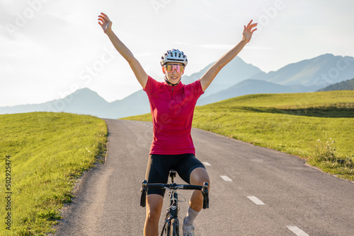 cycle, rider, race, road, victory, raising, pedaling, arm, pose, female, mountain, car, open, route, bicyclist, body, bike, cycling, young, professional, woman, girl, front view, ride, one person, success, succeed, achievement, asphalt, tour, sport, biking, lifestyle, activity, competition, caucasian, racer, summer, sun, day, copy space, sky, power, nature, outdoors, energy, vitality