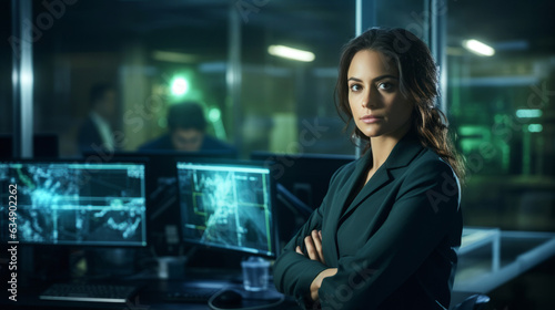 Female data center engineer. Machine learning and work with artificial intelligence
