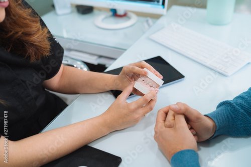 Female dentist holding tooth mold, explaining something to her patient during medical consultation at her clinic. Orthodontist showing her client denture. Experience, medical treatment concept.