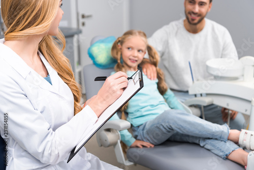 female dentist with clipboard talking to little child and her young father