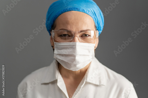 Female doctor face, close up shot. Mature woman in protective mask and goggles looks at camera. Isolated on gray.