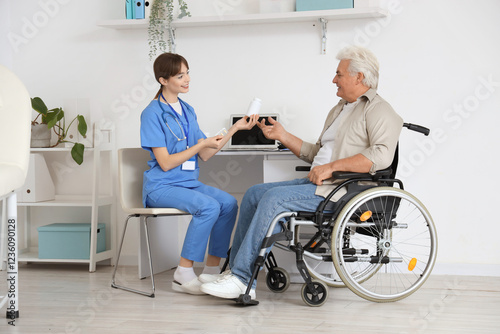 doctor, female, giving, hospital, male, patient, pill, wheelchair, adult, aged, appointment, assistant, care, caucasian, clinic, make well, diagnosis, disease, elderly, exam, girl, health, indoor, job, man, mature, medicals, medication, medicine, modern, occupation, old, people, person, physician, portrait, prescription, profession, senior, service, disease, sitting, smiling, specialist, symptom, treatment, visit, woman, work