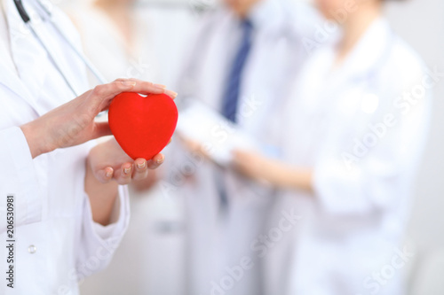 Female doctor holding heart in her hands. Doctor and patient sitting in the background. Cardiology in medicine and health care