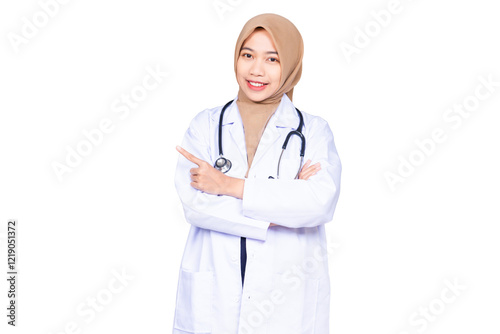 female, doctor, pointing, finger, isolated, transparent, medicals, health care, professional, confident, hospital, clinic, medicine, uniform, physician, specialist, health, care, practitioner, treatment, consultation, nurse, expert, diagnosis, patient, friendly, portrait