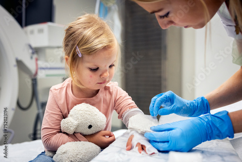 Female doctor tying bandage on blond girl's hand in ward at hospital