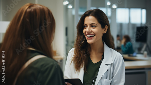 Female doctor with clipboard talking to smiling woman patient discussing something at hospital. Medicine and healthcare concepts. Generative AI