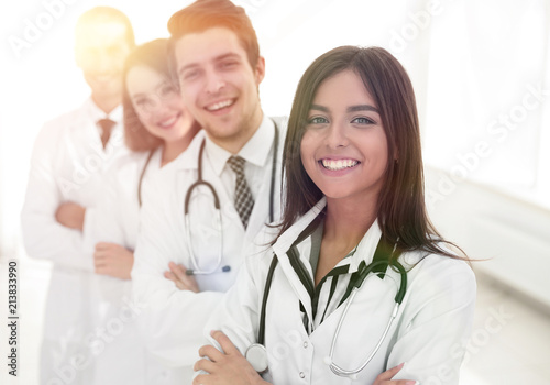 female doctor with group of happy successful colleagues
