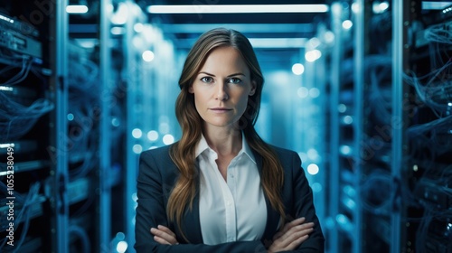 female engineer confidently posing with arms crossed in front of a busy data center