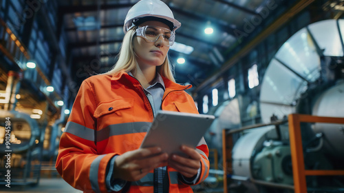 Female engineer in safety gear holding a tablet, overseeing operations in a modern industrial facility, focus on technology and efficiency