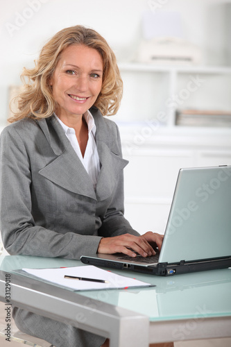 business, occupation, communication, career, woman, female, adult, secretary, executive, thinking, working, suit, laptop, computer, wi-fi, beautiful, pretty, blonde hair, long hair, smiling, happy, sitting, desk, indoor, office, portrait, caucasian, front view, person