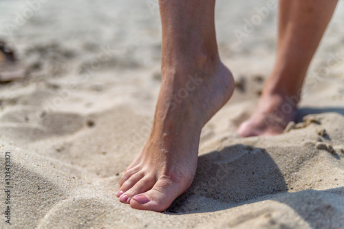 female feet on sand at beach in summer in sunny weather