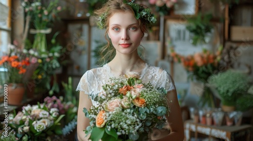 Female florist presenting a beautiful bouquet in a flower shop with blurred background