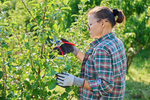 Female gardener with pruning shears pruning apple tree in the garden
