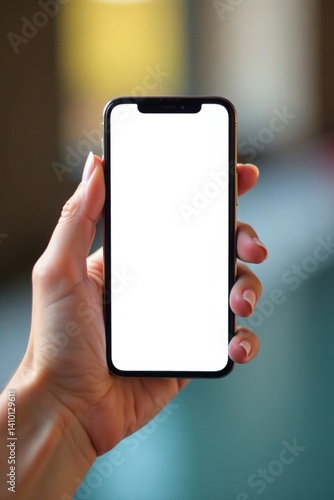 Female hand holding a cell phone with a blank white screen, surrounded by soft focus background, sleek, blank screen