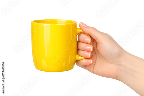 Female Hand Holding Bright Yellow Ceramic Mug Isolated on Transparent Background, Minimalist Coffee & Lifestyle Concept