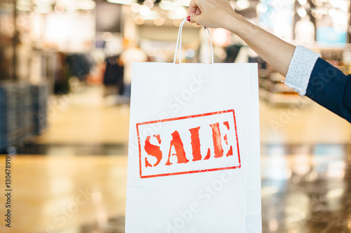 sale, person, shopping bag, lifestyle, shopping, client, bag, shopaholic, shopper, people, young, adult, female, crop, hand, holding, faceless, unrecognizable, mall, shop, buyer, white, packet, blurred background, indoor, consumer, purchase, horizontal, discount, store