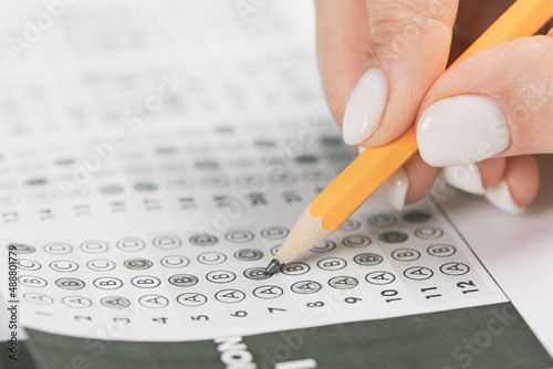 Female hand holds pencil and marks answers to test. Hiring Testing Concept