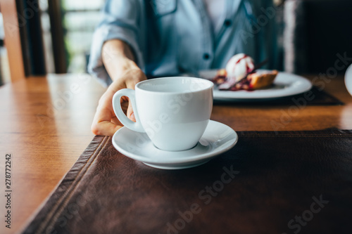 afternoon, beautiful, beverage, breakfast, cafes, caucasian, ceramic, closeup, hot drink, culture, cup, day, dessert, drink, female, food, girl, give, hand, healthy, hold, hot, indoor, lady, leisure, lifestyle, lunch, morning, people, person, relaxation, eatery, saucer, sitting, table, tea, white, woman, wooden, young